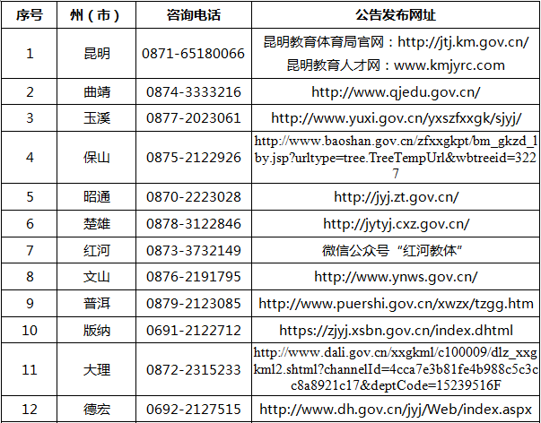 云南各州市中小學教師資格認定公告的查詢網(wǎng)址及聯(lián)系方式