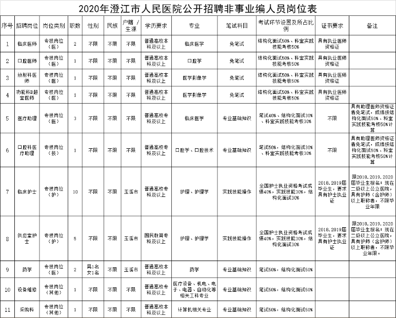 澄江市人民醫(yī)院2020年度面向社會公開招聘非事業(yè)編制工作人員38名,F(xiàn)將第一批招聘28名工作人員有關事宜公布如下: